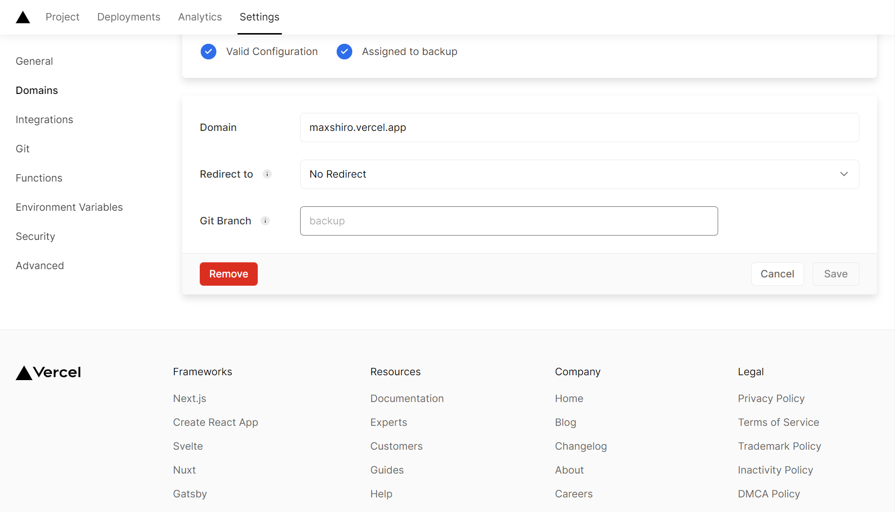 cname-china.vercel-dns.com。 - 将 Git Branch 里的内容改为存放自己博客备份的分支,比如我的就是 backup 分支。同时也可以将分配给你的二级域名也改成这个分支。